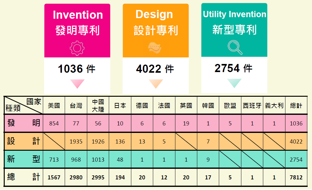 本公司在專利布局上遍及台灣、中國大陸、美國、歐洲、日本、韓國等地區,總獲得專利數量近8千件。截至 2025 年 8 月 31 日止,本公司於全球專利總數為 7,812 件。