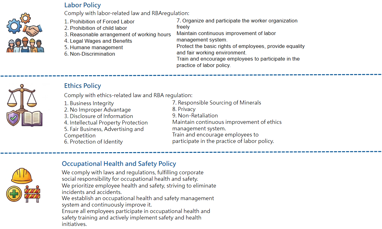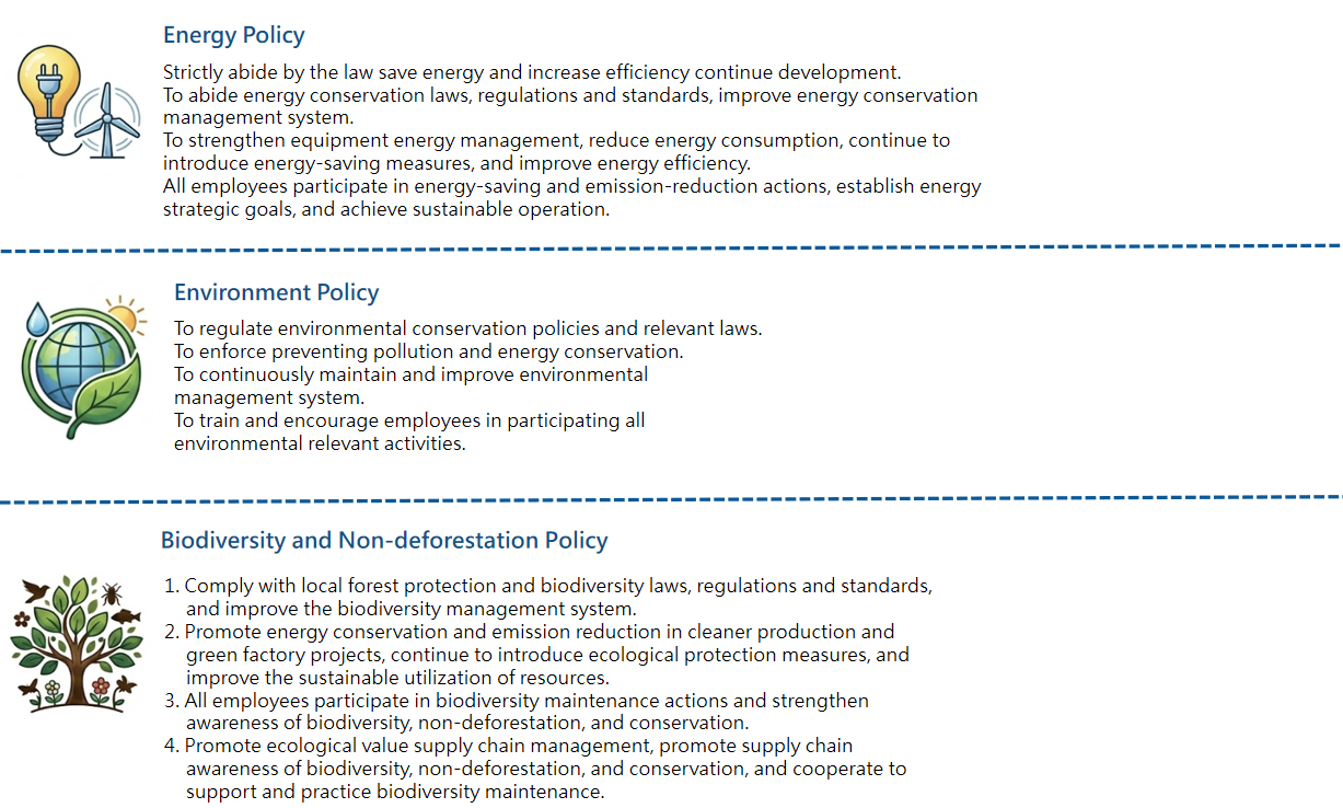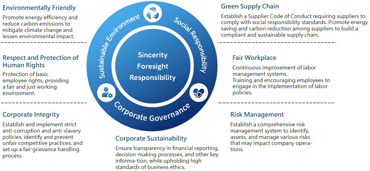 The Governance and Sustainability teams, considering international trends and relevant standards, has formulated FOXLINK’s Sustainability Policy. This policy encompasses three major aspects: corporate governance, environment, and society, comprising a total of seven key principles. It serves as the highest guiding spirit for the Company’s sustainable development and aligns with the publicly disclosed sustainable development principles, thereby advancing the path toward sustainability. Based on this Sustainability Policy, various policies and codes have been established, including but not limited to the following: Code of Corporate Integrity, Corporate Governance Best Practice Principles, Code of Practice on Sustainable Development, Risk Management Policy, Information Security Management Policy, Labor Policy,Ethics Policy, Environmental Policy, Occupational Health and Safety Policy, Energy Policy, and Conflict Minerals Policy. These are detailed in their respective chapters.